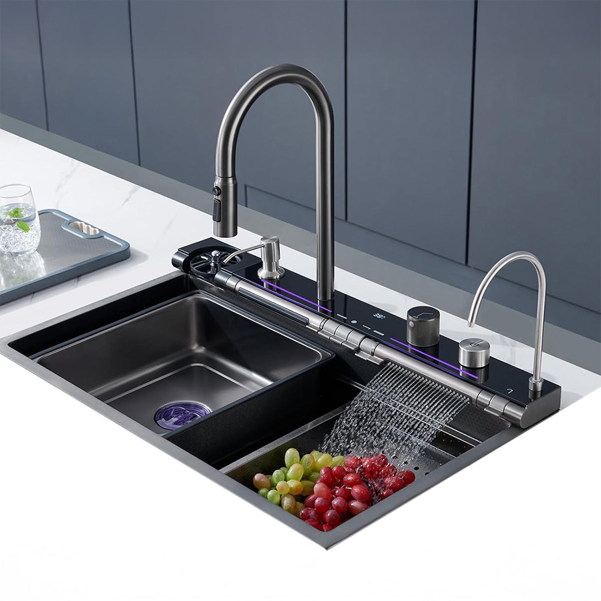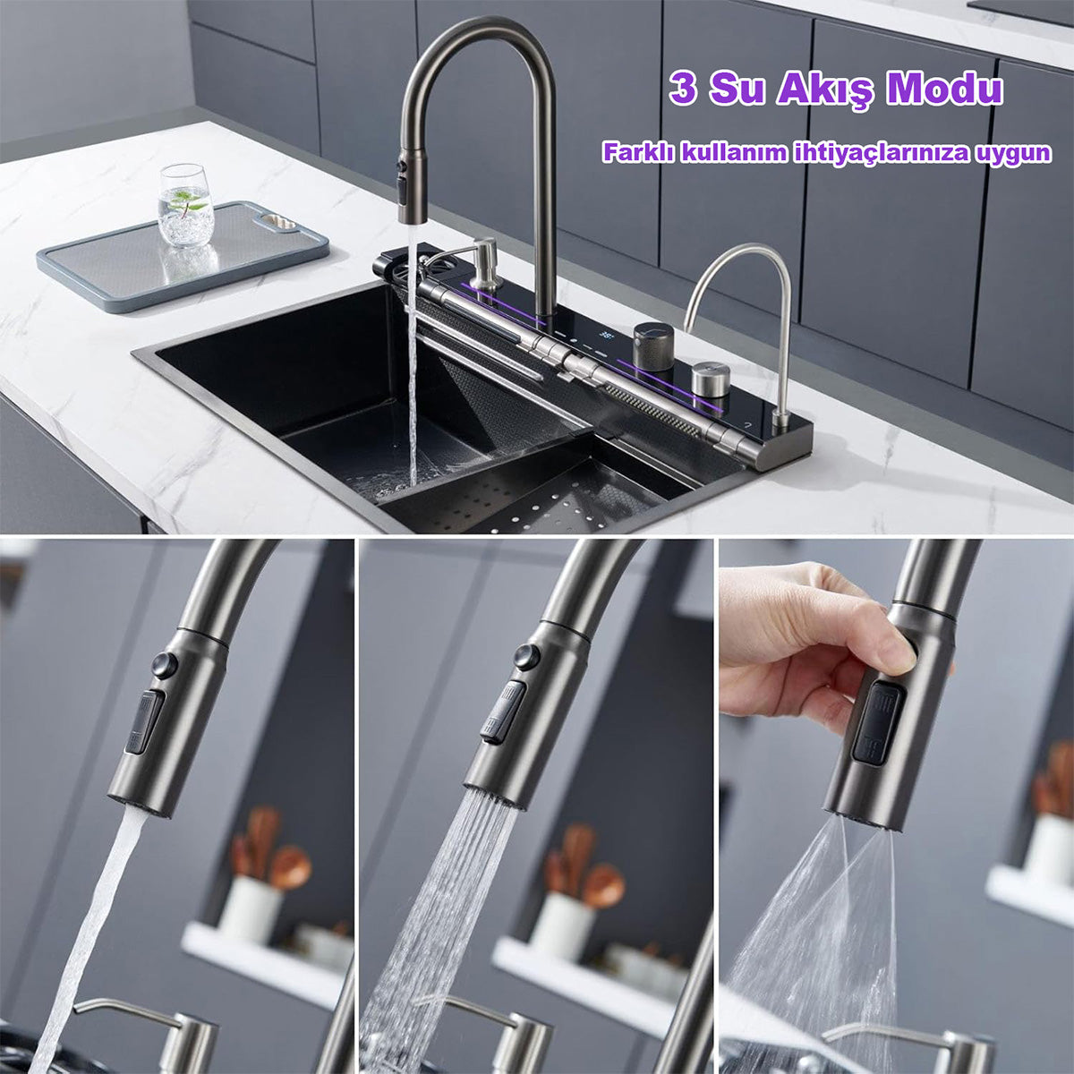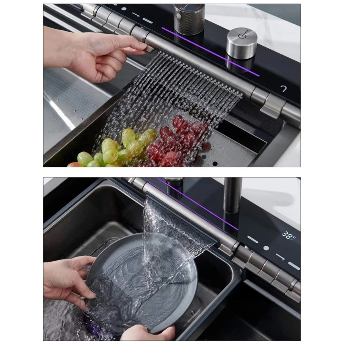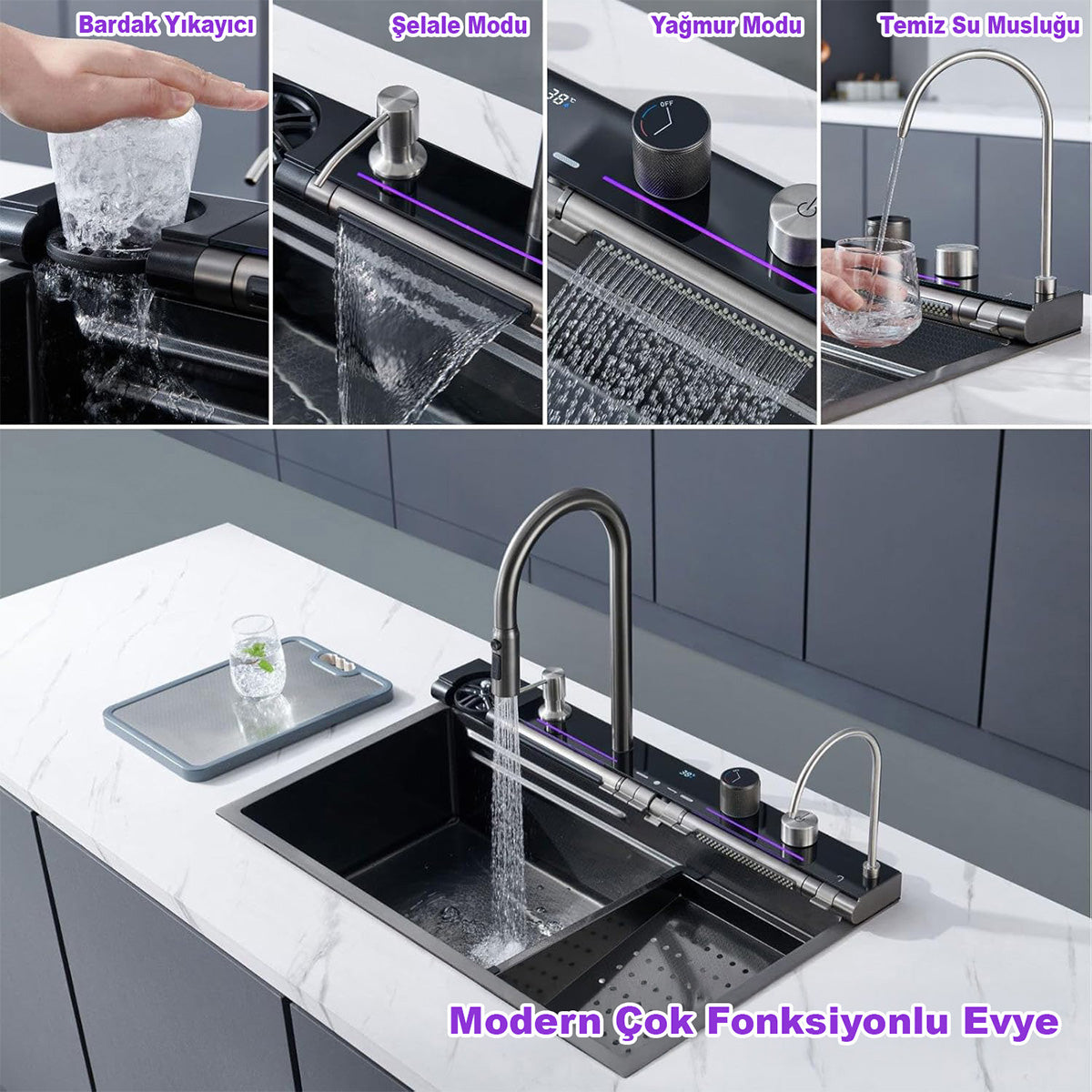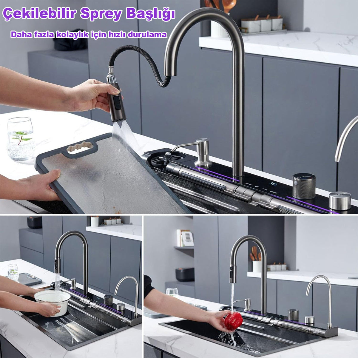 Bardak yıkayıcı, şelale/yağmur modu ve temiz su musluğu bir arada. Hepsi tek panelde, maksimum verimlilik için bir araya getirildi.