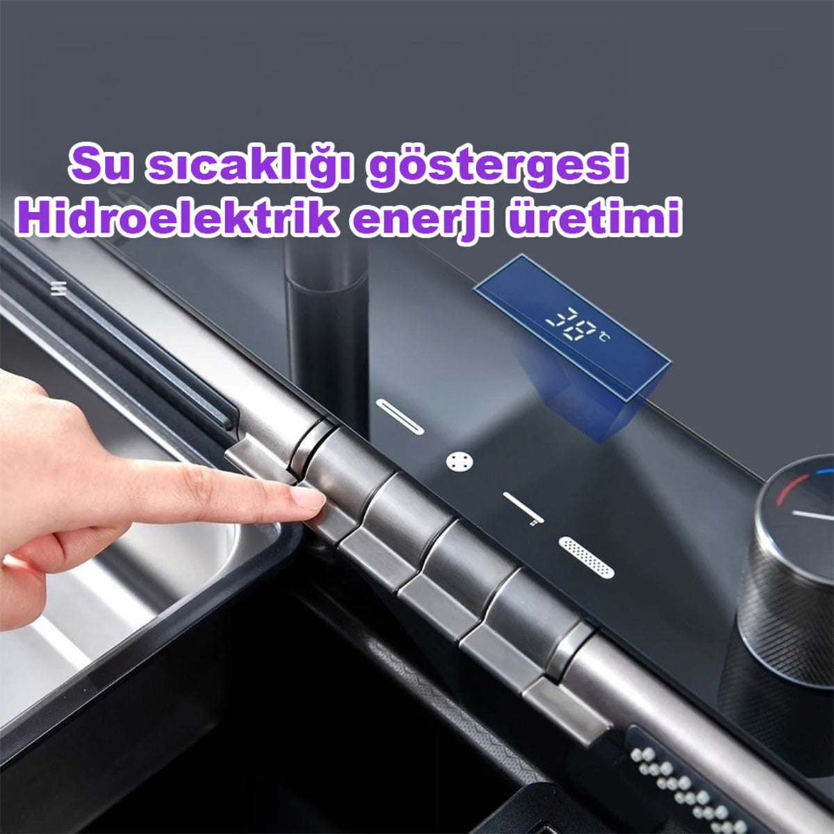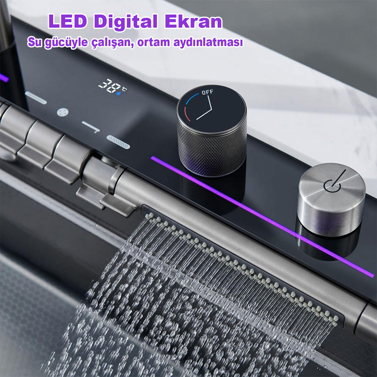 Su akışıyla çalışan LED ekran sayesinde sıcaklığı anlık görürsünüz. Elektrik bağlantısı veya pil gerektirmez; hidroelektrik sistemle enerji üretir.