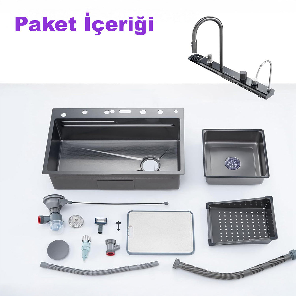 Set içerisinde ana eviye, yardımcı göz, süzgeçli hazne, musluk ünitesi, hortumlar, filtre aparatı gibi tüm bileşenler eksiksiz olarak sunulur.