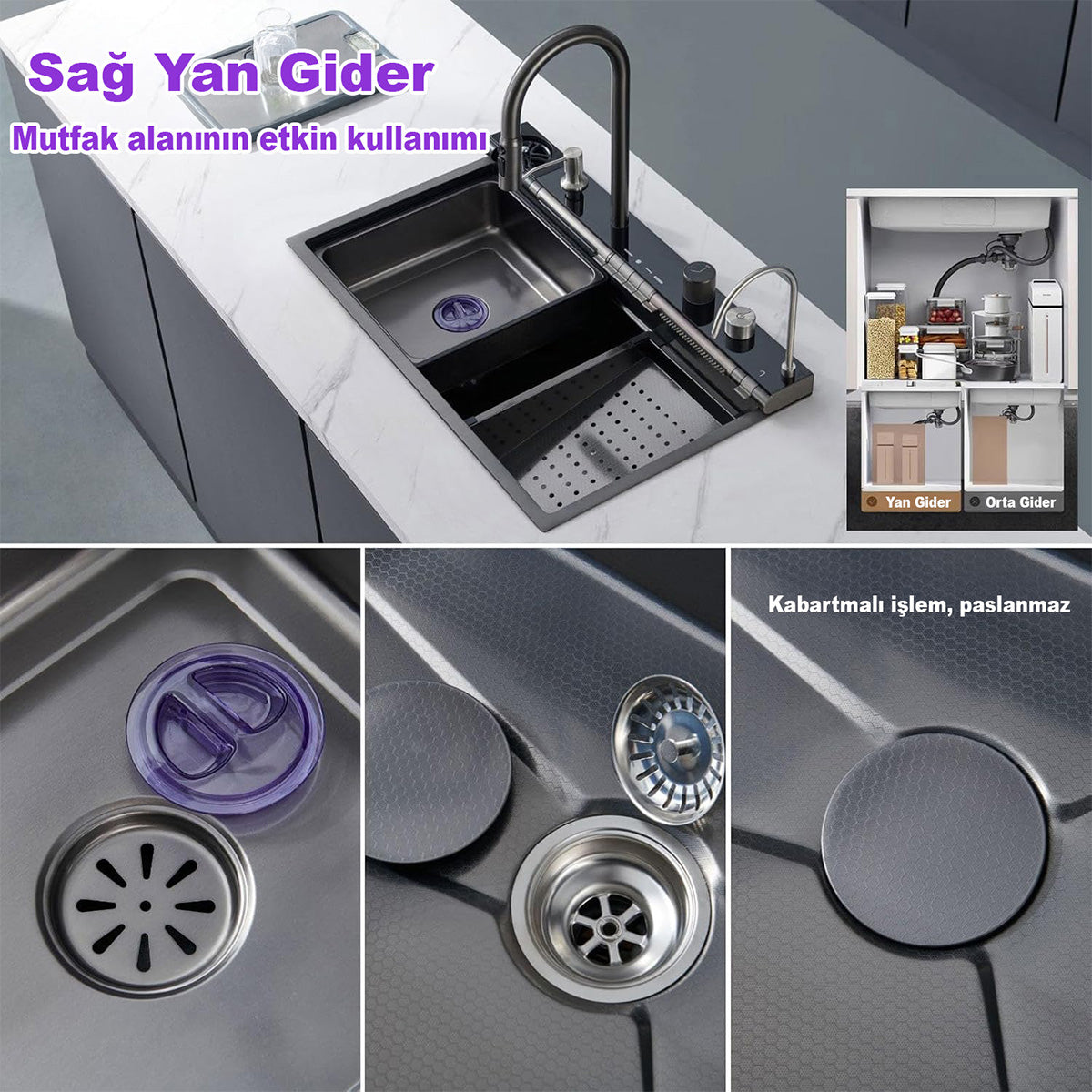 Sağda konumlandırılmış gider sayesinde alt dolap içi daha düzenli. Kabartmalı yüzey ise paslanmaz ve kolay temizlenir yapı sunar.