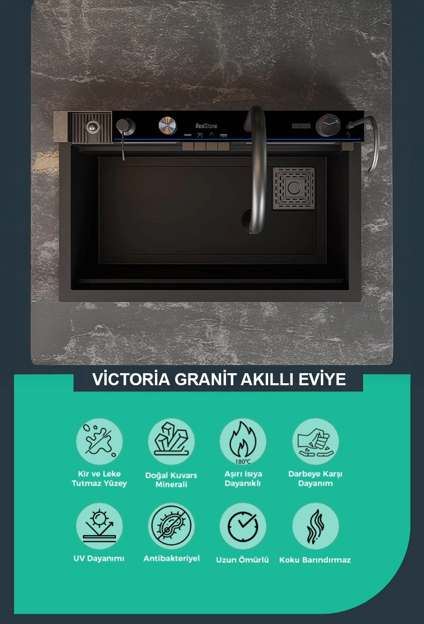 RealStone’un granit serisine katılan Victoria Akıllı Eviye, yenilikçi tasarımı ve üstün teknolojisiyle mutfağınıza yeni bir soluk getiriyor.