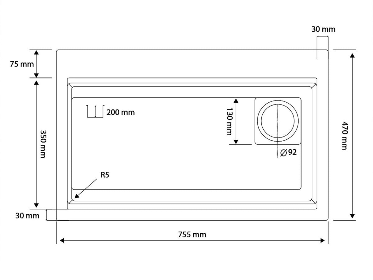 Victoria Granit Akıllı Eviye, 755 mm genişlik ve 470 mm derinliğe sahiptir.