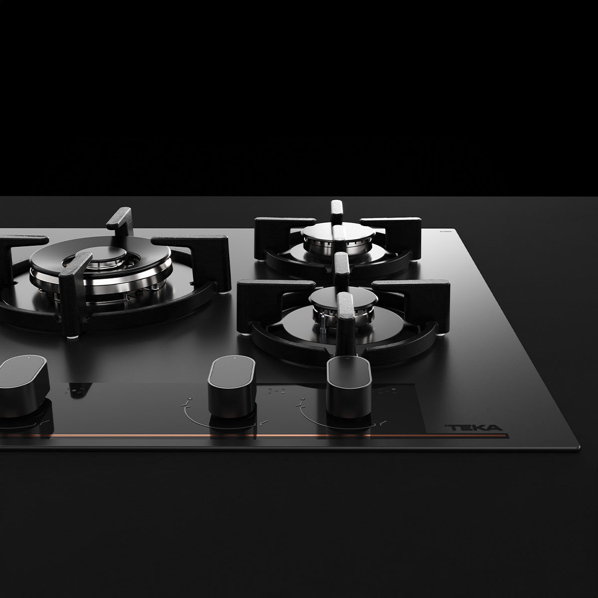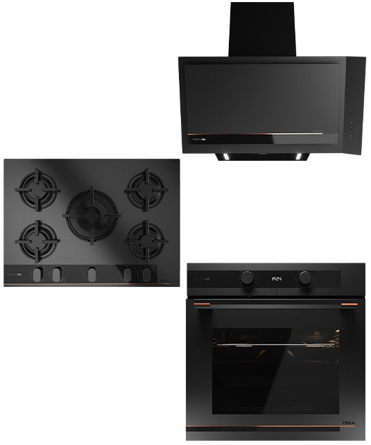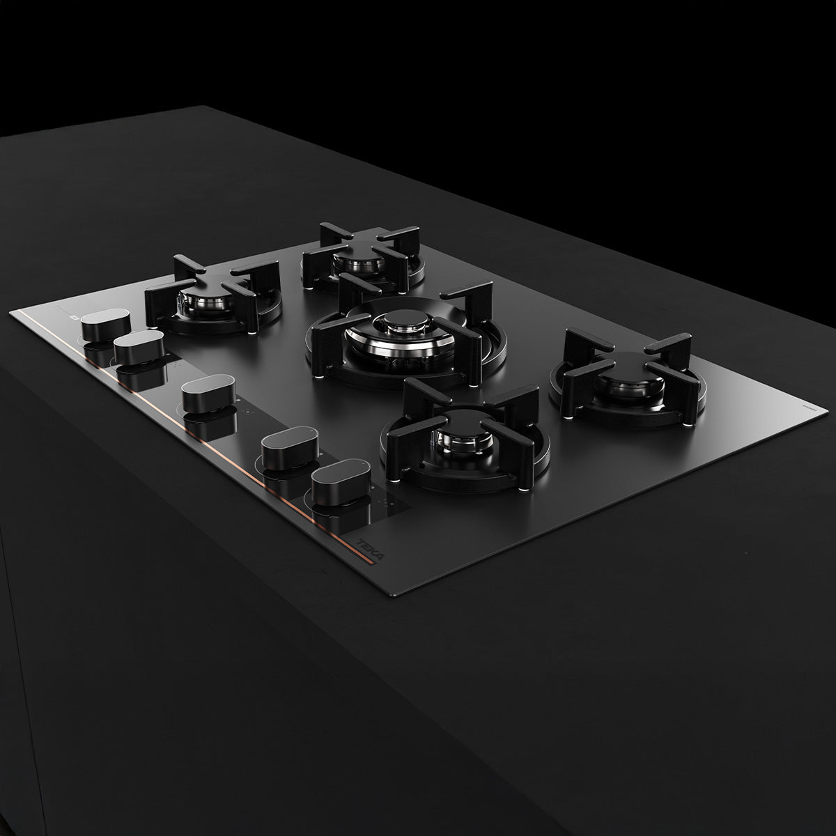 Özel mat siyah yüzey üstünde bakır rengi detaylara sahip cam gazlı ocak