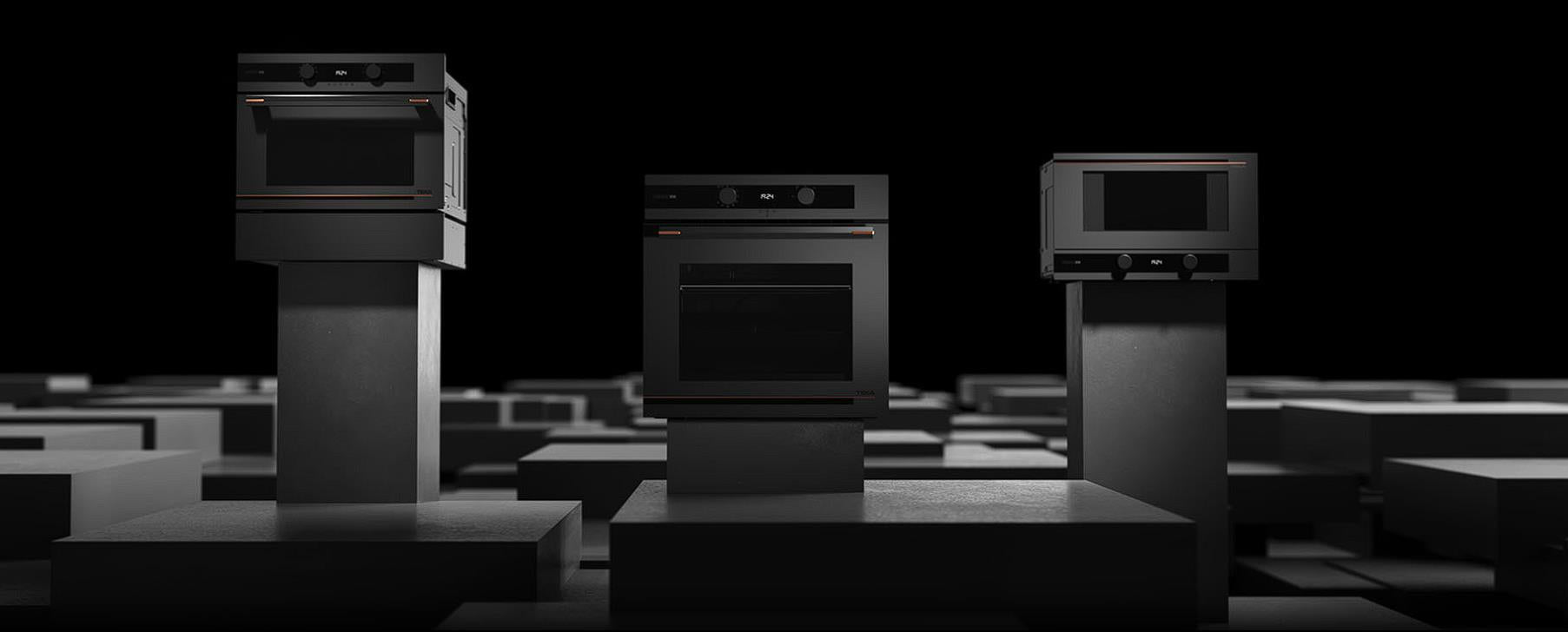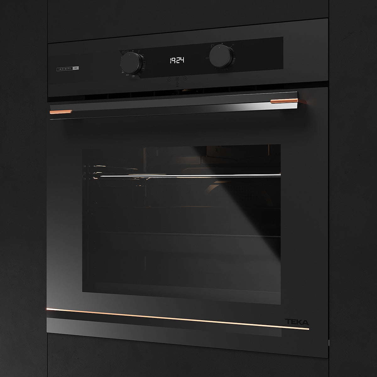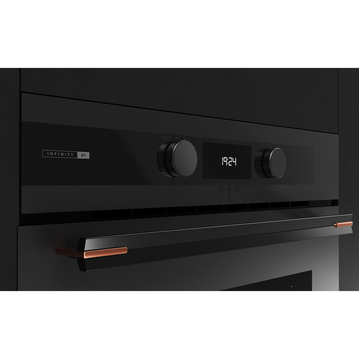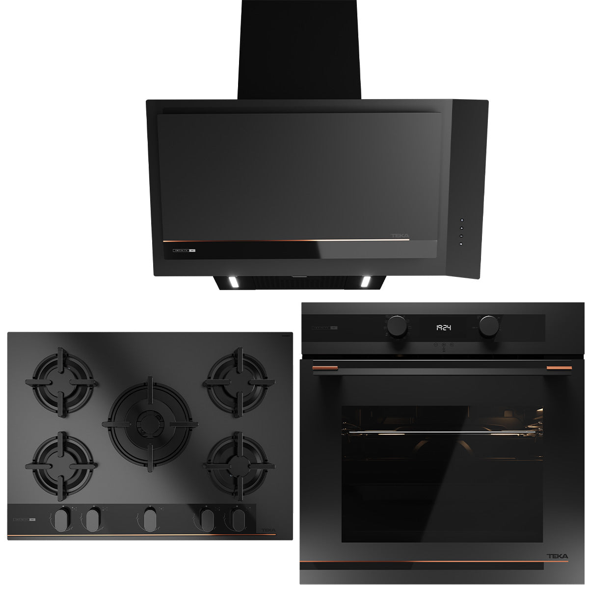 Özel mat siyah yüzey üstünde bakır rengi detaylara sahip cam davlumbaz